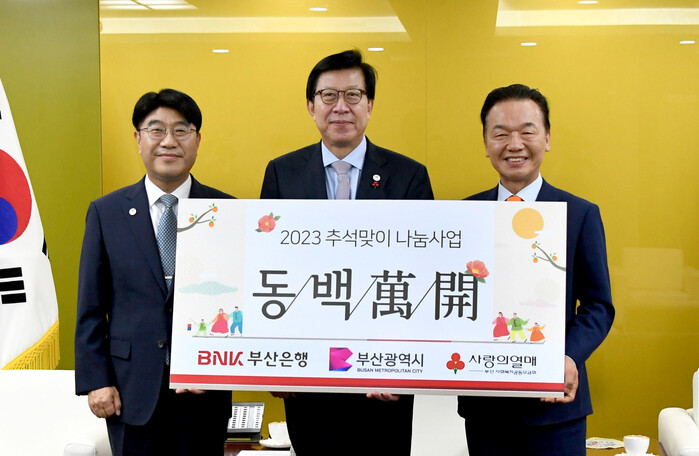 [메가경제=오민아 기자] BNK부산은행(은행장 방성빈)은 22일 부산시청에서 부산시와 추석을 맞아 소외계층에게 5억원 상당의 복 꾸러미를 지원하는 ‘동백만개’ 나눔사업 전달식을 가졌다고 밝혔다.