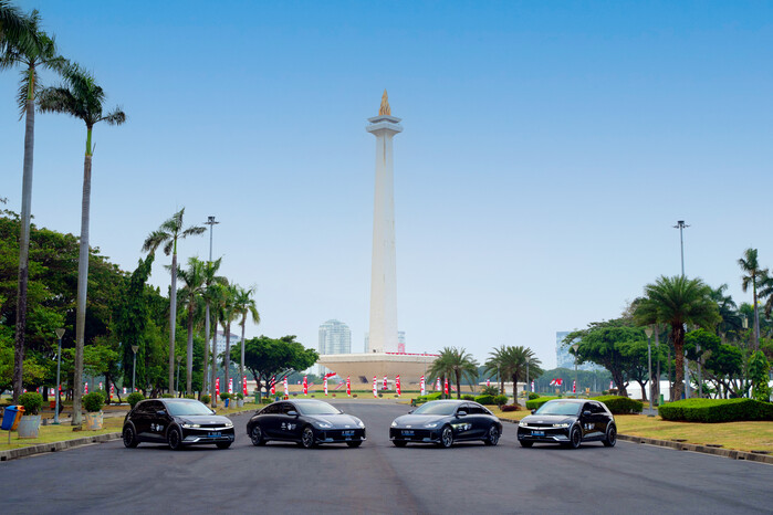 ▲인도네시아 자카르타의 모나스 광장 독립기념탑 앞에 제43차 아세안 정상회의 공식 차량인 현대자동차 전기차 모델 아이오닉 5, 아이오닉 6이 포진해있다. [사진=현대자동차] |