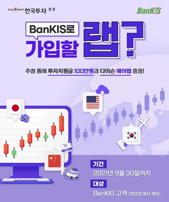 한국투자증권(사장 정일문)은 9월 30일까지 뱅키스(BanKIS) 고객을 대상으로 ‘뱅키스로 가입할 랩?’ 이벤트를 시행 중이다. 뱅키스는 비대면 또는 시중은행을 통해 개설하는 한국투자증권 온라인 거래 서비스다.