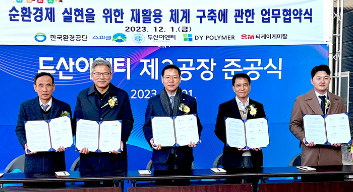 이날 두산이엔티 횡성공장에서 열린 협약식에는 최창배 DY폴리머 대표, 정재웅 한국환경공단 자원순환본부장, 전동훈 스파클 대표이사, 탁용기 두산이엔티 대표, 이동수 SM티케이케미칼 사장 등 관계자들이 참석했다. 이번 협약을 통해 참여기업들은 폐페트병을 재활용, 다시 생수병으로 쓰는 '보틀 투 보틀(Bottle to Bottle)'을 실현해 플라스틱 순환경제 활성화에 앞장서기로 뜻을 모았다.