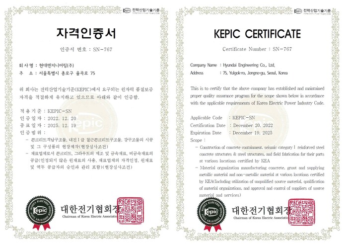 ▲ KEPIC 인증서 [현대엔지니어링 제공] |