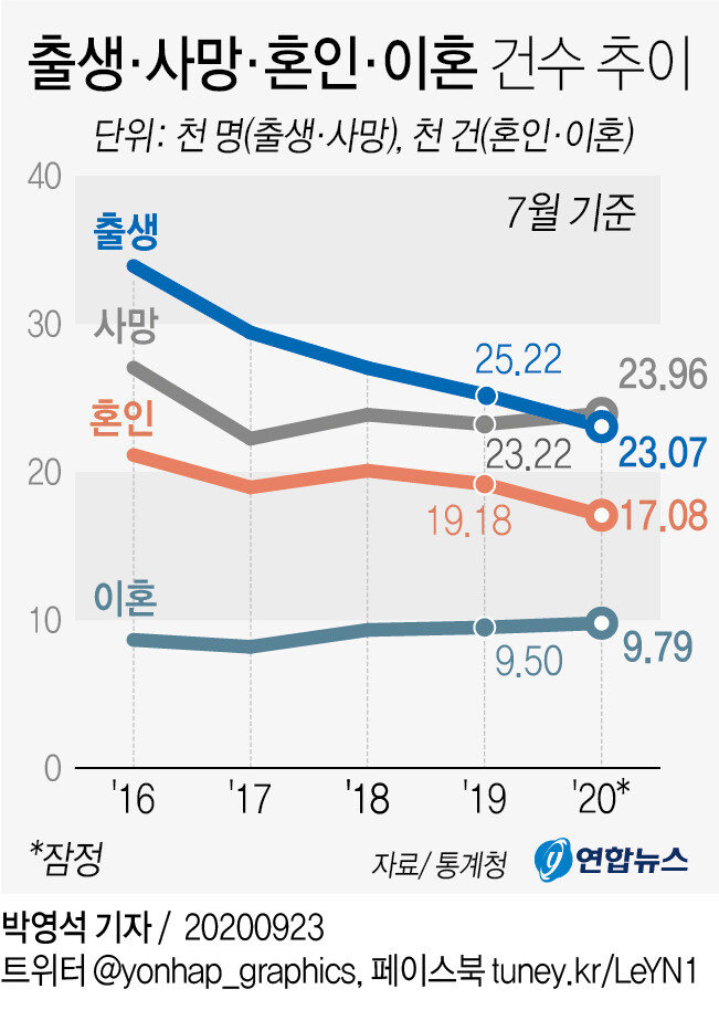 ▲ 2016년도 부터 현재까지 출생·사망·혼인·이혼 건수 추이. [그래픽= 연합뉴스] |