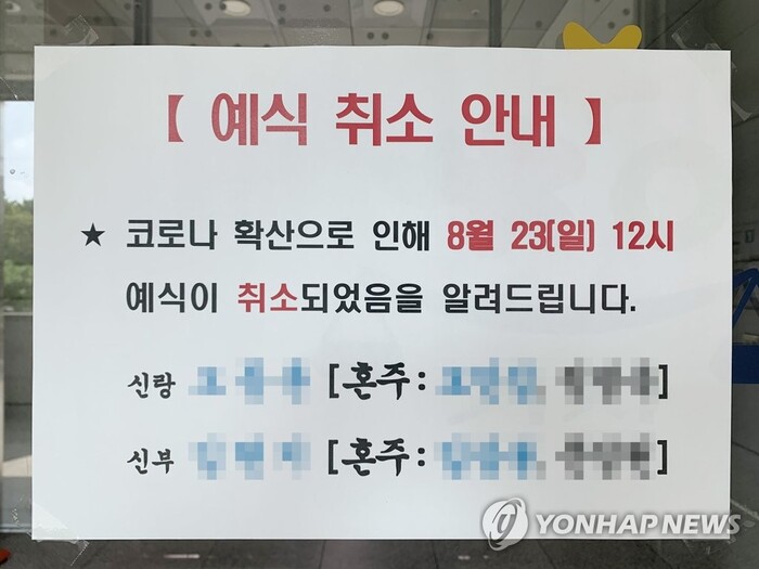 ▲ 정부의 사회적 거리두기 시행 후 서울 시내의 한 예식장 앞에 예식 취소 공지문이 붙여져 있다. [사진= 연합뉴스] |