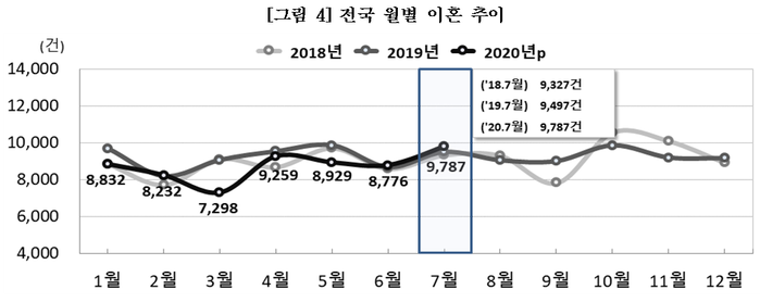 7월 이혼 건수는 9787건으로 전년 동월 대비 290건(3.1%) 증가했다.