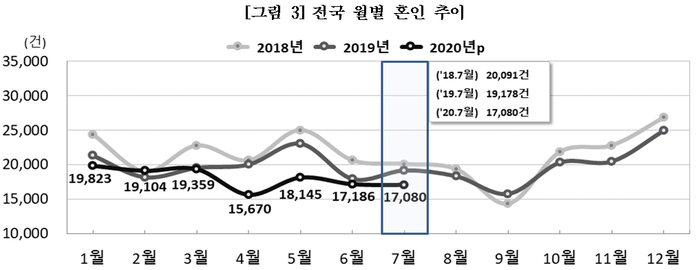 7월 한 달 간 신고된 혼인 건수는 1만7080건으로 1년 전보다 10.9% 급감했다.
