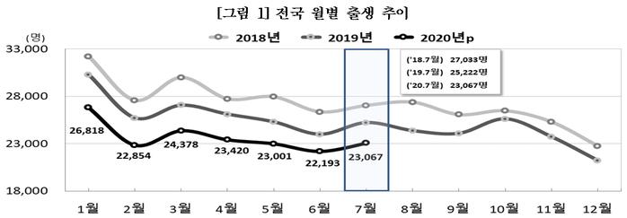 7월 기준으로 1981년 관련 통계를 집계한 이래 최소치다. 출생아 수는 같은 달 기준 역대 최소 기록을 52개월째 다시 쓰고 있다.