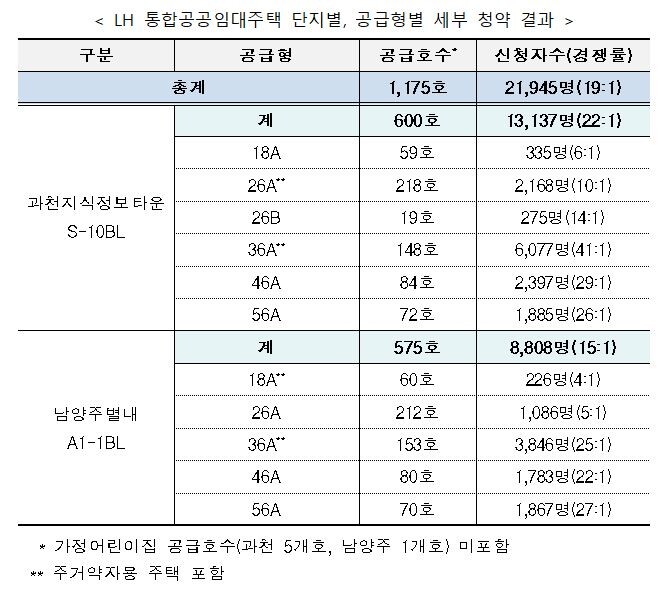 과천지식정보타운 S-10블록에는 약 1만 3000명, 남양주별내 A1-1블록에는 약 8800명이 신청해 각각 22대 1, 15대 1의 경쟁률을 기록했다.