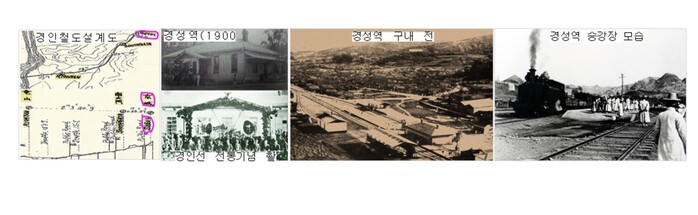| ▲사진 좌측부터 경인철도설계도면, 경성역(1900년)과 경인선 전통기념 촬영, 경성역 구내 전경,경성역 승강장 모습 |