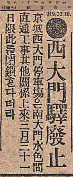 그러나 1919년 3월 1일부터 시작된 독립 만세운동의 집결지로 이용된 서대문역 광장은 아예 서대문역을 없애버리는 원인을 제공하게 되어 1919년 3월 18일 매일신보에 갑자기 ‘서대문역을 남대문~수색 간 직통공사 관계로 3월 31일 자로 폐지한다’는 기사가 보도됐다.