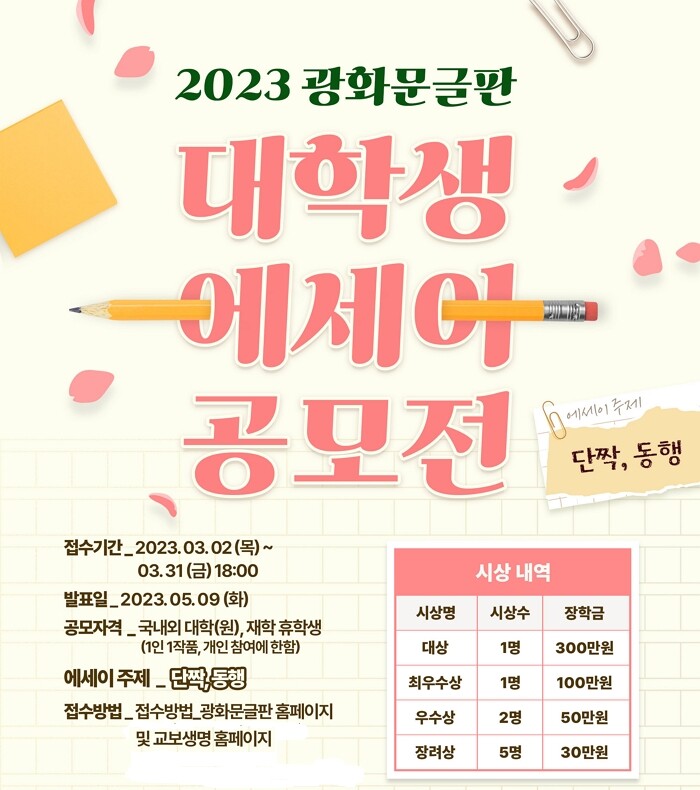 교보생명이 새봄을 맞아 청춘들의 감성 충만한 이야기에 귀 기울이기 위해 '2023 광화문글판 대학생 에세이 공모전'을 개최한다고 13일 밝혔다.
