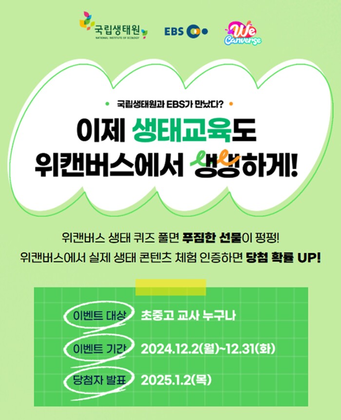 ‘위캔버스’ 생태교육 퀴즈 이벤트는 전국의 초·중·고 교사라면 누구나 이벤트에 응모할 수 있으며, 이벤트에 참여한 모든 교사에게는 음료 기프티콘을 선착순 증정한다. 나아가 위캔버스 생태교육 콘텐츠를 체험하고 인증하면 푸짐한 경품을 추첨 제공한다. 이벤트 관련 세부 내용은 EBS 홈페이지에서 확인할 수 있다.