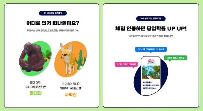 [메가경제=양대선 기자] EBS(사장 김유열)의 위캔버스(WeCanverse)가 신규 교육 콘텐츠인 ‘생태교육’을새롭게 선보이며, 이를 기념한 생태 퀴즈 이벤트를 오는 31일까지 진행한다고 11일 밝혔다.
