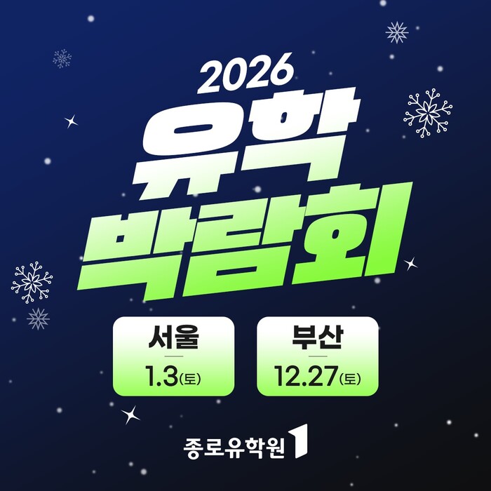 [메가경제=양대선 기자] 올해의 브랜드 대상 18년 연속 수상의 유학전문기업 종로유학원이 2026년 새해 첫 유학박람회를 내년 1월 3일 서울 코엑스와 이달 27일 부산 종로유학원에서 각각 개최한다고 12일 밝혔다. 2026년 가장 빠르게 진행되는 국내 최대 규모의 유학박람회를 통해 세미나 참석으로 기초 정보 수집 및 전문가와 1:1 상담으로 유학 계획을 구체화 할 수 있는 기회가 될 것으로 보인다.