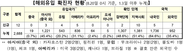 해외유입 확진자 12명의 추정유입 국가는 미국이 3명으로 가장 많았다. 이어 카자흐스탄·우크라이나 2명, 필리핀·몰도바·체코·캐나다·브라질에서 각 1명씩 확진자가 발생했다.