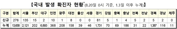 지역발생 276명을 지역별로 보면 서울 135명으로 가장 많았다. 이어 경기 81명, 부산 15명, 인천 10명, 대전 8명, 강원·전북·경북 5명, 충남 4명, 대구·전남·경남 2명, 광주·충북에서 각 1명씩 확진자가 나타났다.