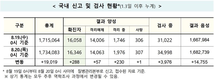 중앙방역대책본부(방대본)는 20일 0시 기준 전날 대비 코로나19 신규 확진자가 총 288명으로 증가하며, 총 누적확진자 수는 1만6346명이라고 밝혔다.