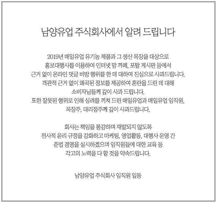 남양유업은 "2019년 매일유업 유기농 제품과 그 생산 목장을 대상으로 홍보대행사를 이용하여 인터넷 맘 까페, 포탈 게시판 등에서 근거 없이 온라인 댓글 비방 행위를 한 데 대하여 진심으로 사과드립니다"라고 밝혔다.