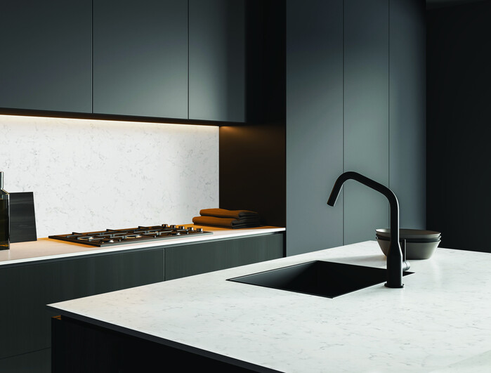 ▲ 주방 상판과 벽면에 '센스톤 쿼츠' '비너스'를 시공한 이미지. [사진=KCC글라스] |