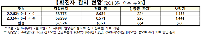 ▲ 3일 0시 기준 전날 대비 코로나19 확진자 관리 현황. [출처= 중앙방역대책본부] |