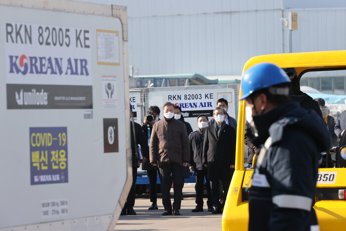 ▲ 문재인 대통령이 3일 오전 인천국제공항 대한항공 화물터미널에서 열린 코로나19 백신 수송 모의훈련에서 백신 물류 과정을 참관하고 있다. [영종도= 연합뉴스] |