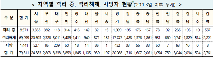 ▲ 3일 0시 기준 전날 대비 코로나19 지역별 격리 및 사망자 현황. [출처= 중앙방역대책본부] |