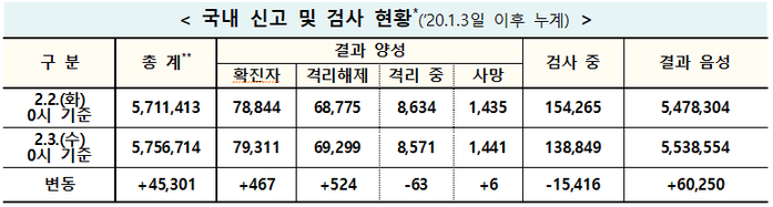 ▲ 3일 0시 기준 전날 대비 코로나19 국내 신고 및 검사 현황. [출처= 중앙방역대책본부] |