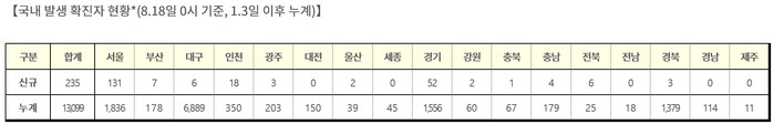 이날 국내 발생자 235명을 지역별로 보면, 17개 광역지방자치단체 중 대전, 세종, 전남, 경남, 제주 등 5곳을 제외한 12곳에서 확진자가 발생해 전국적인 확산세를 보였다.