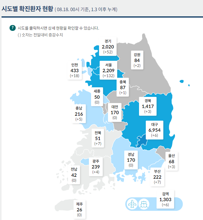 ▲ 18일 0시 기준 코로나19 시도별 확진환자 현황. [출처= 중앙방역대책본부] |
