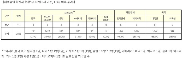 ▲ 18일 0시 기준, 코로나 19 해외유입 확진자. [출처= 중앙방역대책본부] |