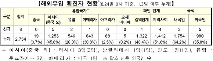 해외유입 확진자 8명의 추정유입 국가는 러시아 3명, 우크라이나 2명, 방글라데시· 인도·미국 1명이다.