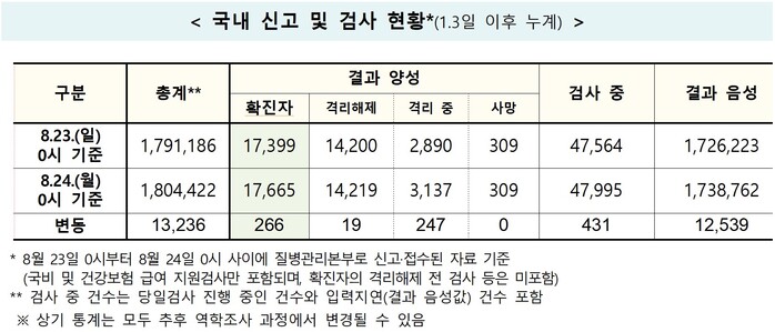 중앙방역대책본부(방대본)는 24일 0시 기준 전날 대비 코로나19 신규 확진자가 266명 추가 발생해, 총 누적확진자 수는 1만7665명이라고 밝혔다.