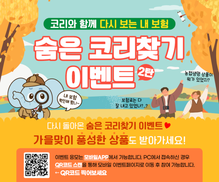 고객이 NH농협생명 앱 이벤트 페이지에 접속한 뒤 숨은 코리를 찾는 미션을 수행한 다음 이벤트 응모 버튼을 클릭하고 마케팅 활용에 동의하면 자동 응모된다. NH농협생명은 이번 이벤트 참여 고객에게 선착순으로 아이스아메리카노 쿠폰 1000매를 증정한다.