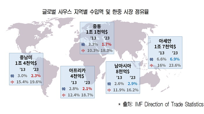 글로벌 사우스 지역의 수입시장에서 한국과 중국의 시장 점유율을 비교해 본 결과, 한국의 점유율은 3.7%로, 10년전과 비교해 0.3%p 감소한 반면 중국의 점유율은 20%로 10년전에 비해 6.2%p 증가했다.