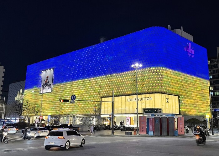 | ▲ 우크라이나 국기 색 담은 갤러리아백화점 외관 미디어 아트 [사진=갤러리아 백화점 제공] |