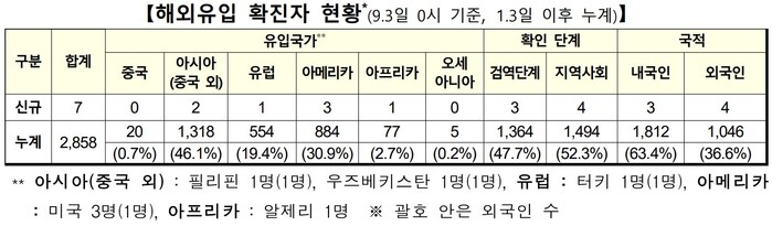 해외유입 확진자는 7명으로, 이 가운데 3명은 공항이나 항만 입국 검역 과정에서 확인됐다. 나머지 4명은 지역 거주지나 임시생활시설에서 자가격리하던 중 양성 판정을 받았다.
