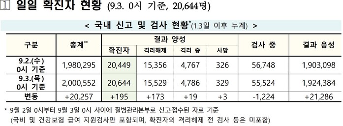 중앙방역대책본부(방대본)는 3일 0시 기준 전날 대비, 코로나19 신규 확진자가 195명이 추가발생해 전날(267명)보다 72명이나 줄었다고 밝혔다. 이로써 지금까지 총 누적 확진자 수는 2만644명을 기록됐다.