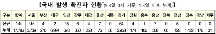 이날 국내발생 신규 확진자 188명을 지역별로 보면, 서울 69명, 경기 64명, 인천 15명으로 수도권에서 전체의 78.7%인 148명이 발생했다. 비수도권은 울산·충남 각 7명, 광주 6명, 전남 5명, 부산·대전·강원 각 4명, 대구 2명, 충북 1명이 확진됐다.