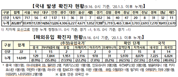 신규 확진자 1943명을 감염경로별로 보면 전국 곳곳에서 나온 국내발생(이하 지역발생)은 1921명이고 해외유입은 22명이다. 전국 17개 광역지자체 시도 모두에서 지역발생 확진자가 나왔다.