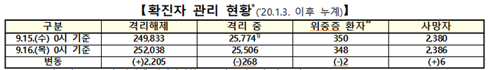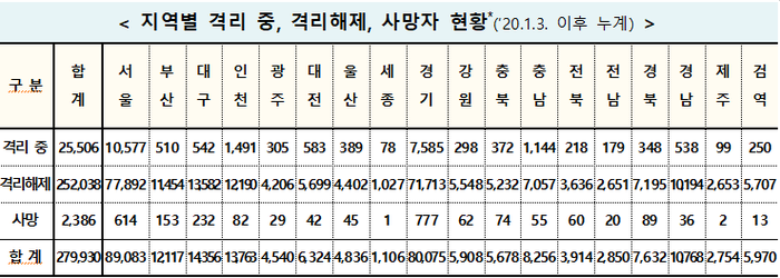 2205명이 추가 완치돼 누적 격리해제자는 25만2038명으로 완치율은 90.04%를 기록했다. 격리치료중 환자는 총 2만5506명으로 전날보다 268명이 줄었다.