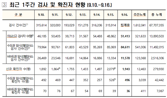 전날 신규 확진자(2079명)보다 136명 줄면서 2천명 아래로 내려왔고, 1주일 전인 9일 목요일 0시 기준의 2049명보다는 106명이 적다. 지난 7월 7일(1211명)부터 72일 연속 네 자릿수 확진자를 이어갔다.
