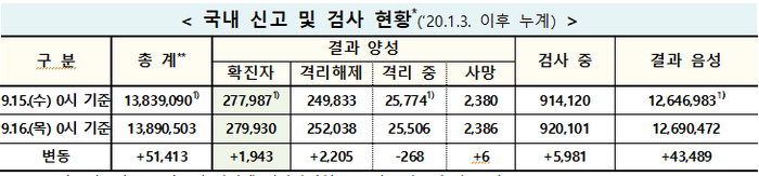 중앙방역대책본부는 16일 0시 기준으로 신규 확진자가 1943명 발생해 누적 27만9930명(해외유입 1만4049명)으로 집계됐다고 밝혔다.