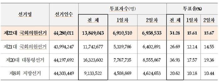 중앙선거관리위원회는 5~6일 이틀간 실시된 22대 국회의원선거 사전투표 결과 사전투표율이 31.28%로 집계됐다고 7일 밝혔다. 5일 첫날은 15.61%, 6일 둘째 날은 15.67%였다.