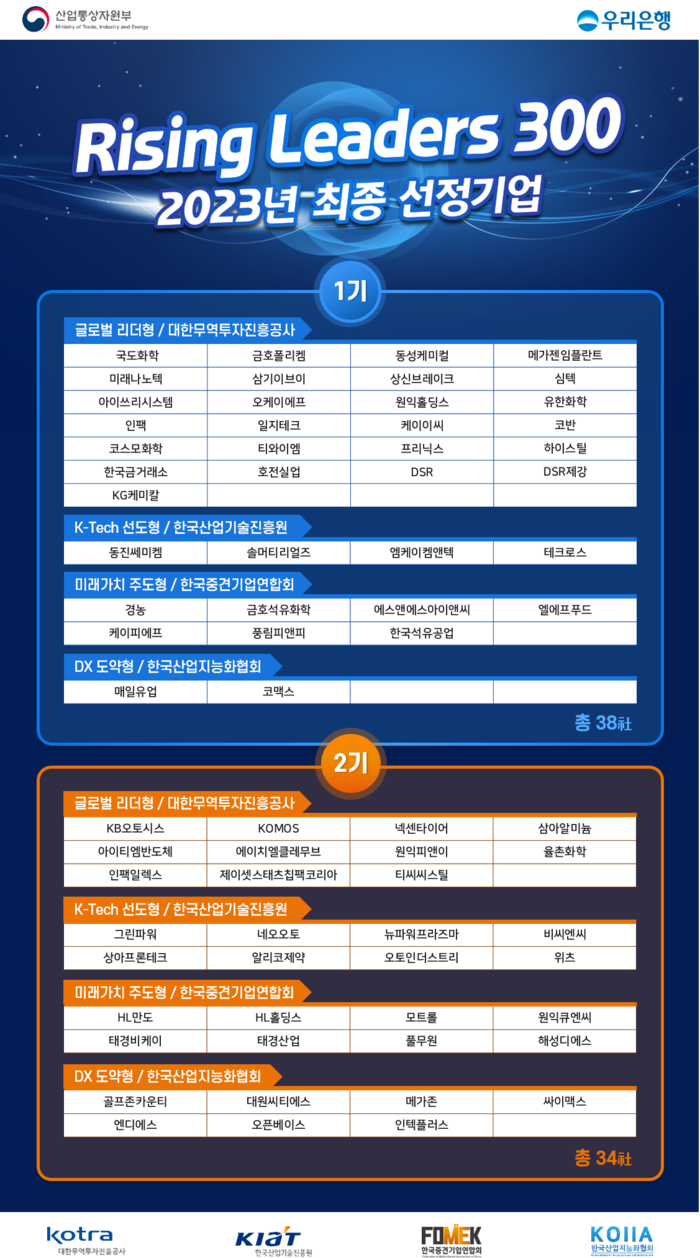 우리은행과 산업통상자원부 및 산하 대한무역투자진흥공사(KOTRA), 한국산업기술진흥원(KIAT), 한국중견기업연합회, 한국산업지능화협회(KOIIA) 등 4개 기관이 함께하는 중견기업 금융 지원사업인 ‘Rising Leaders 300’프로그램은 지난 6월말 38사를 1기 선정했다.