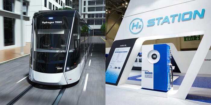 ▲현대로템 수소전기트램(조감도)과 수소충전설비 |