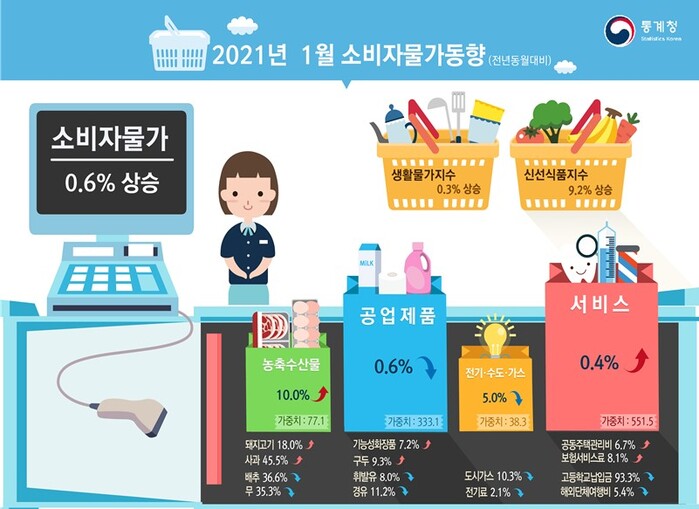 통계청이 2일 발표한 1월 소비자물가 동향에 따르면 1월 소비자물가지수는 106.47(2015년=100)로 작년 동월 대비 0.6% 올랐다.