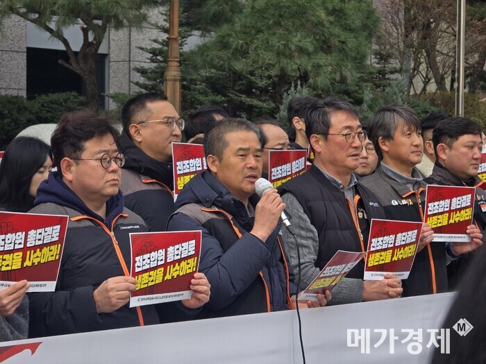 | ▲17일 MG손보 노조는 예금보험공사 정문에서 기자회견을 열고 메리츠화재의 인수합병(M&A) 우선협상대상자 지위 반납 관련 입장을 표명했다. [사진= 메가경제] |