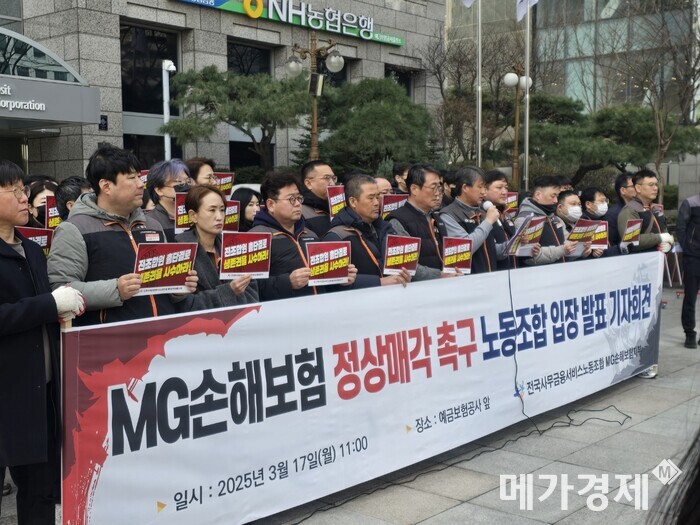 지난 17일 MG손보 노조는 예금보험공사 정문에서 기자회견을 열고 메리츠화재의 인수합병(M&A) 우선협상대상자 지위 반납 관련 입장을 표명했다.