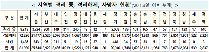 전날 대비 550명이 추가 완치돼 누적 격리해제자는 7만2226명이 됐다. 격리치료 중인 환자는 총 8218명으로 전날보다 110명이 줄었다.