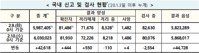 ▲ 10일 0시 기준 전날 대비 코로나19 국내 신고 및 검사 현황. [출처= 중앙방역대책본부] |