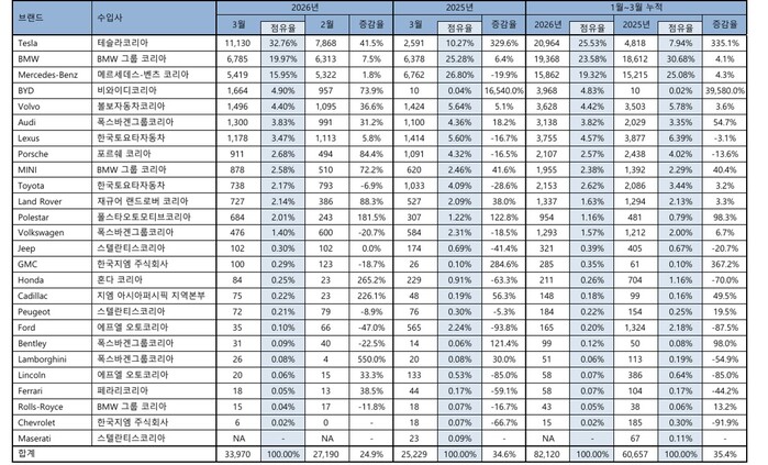 정윤영 KAIDA 부회장은 “3월 수입차 신규 등록은 영업일수 증가와 전기차 판매 호조 영향으로 전월 대비 증가했다”고 설명했다.